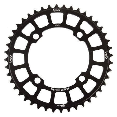 Made in the US from 6061-T6 aluminium alloy, Box Two™ Chainrings are round and true. They fit 104 BCD four-bolt cranks and are available in black anodised with laser-etched graphics from 38 to 45-teeth.